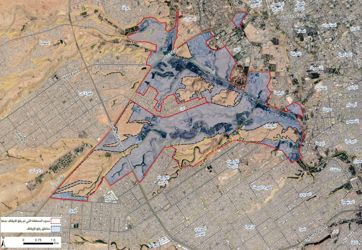 رفعت الهيئة الملكية لمدينة الرياض الإيقاف عن أراضٍ تقع غرب مدينة الرياض بمساحة إجمالية تبلغ 33.24 كيلومتر مربع، مما يتيح لملاك الأراضي والعقارات ممارسة أنشطة البيع والشراء، والتخطيط، والتقسيم، وإصدار رخص البناء، وفقًا للكود العمراني الخاص بمنطقة وادي حنيفة وروافده.