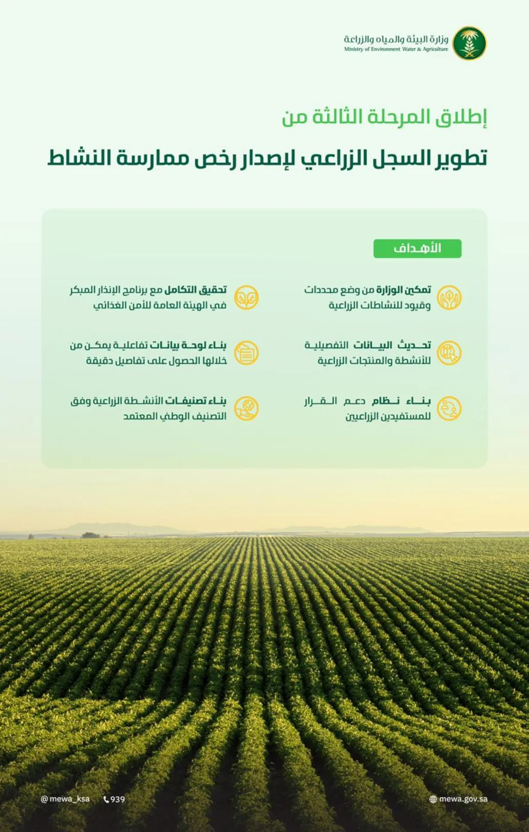 وأوضحت الوزارة أن إصدار الرخصة يتيح للمستفيد تسجيل بيانات كافة الأنشطة الزراعية؛ والحيوانية، والسمكية، وإصدار الرخصة بناءً على ذلك، مبينةً أن الرخصة ستمكّن المزارعين من الاستفادة من الخدمات التي يتم تقديمها للمزارعين. وفق “أخبار 24”.