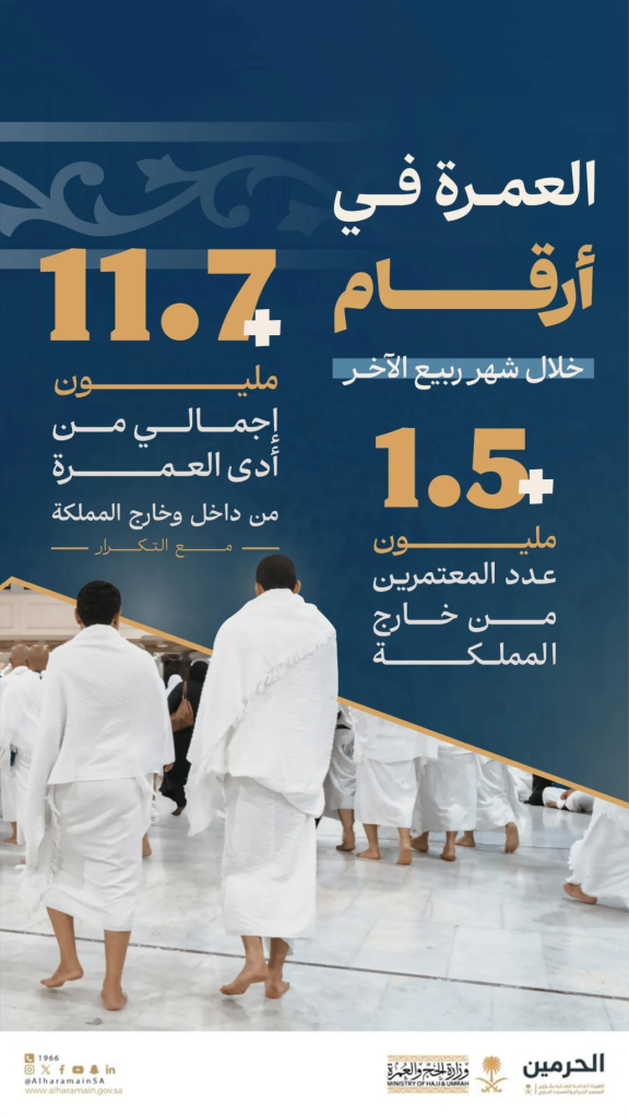 وأوضحت الهيئة العامة للعناية بشؤون المسجد الحرام والمسجد النبوي أن عدد مَن أدوا العمرة تجاوز 11.7 مليون معتمر من داخل المملكة وخارجها، بينهم أكثر من 1.5 مليون معتمر قدموا من خارج البلاد، وذلك خلال الشهر ذاته.