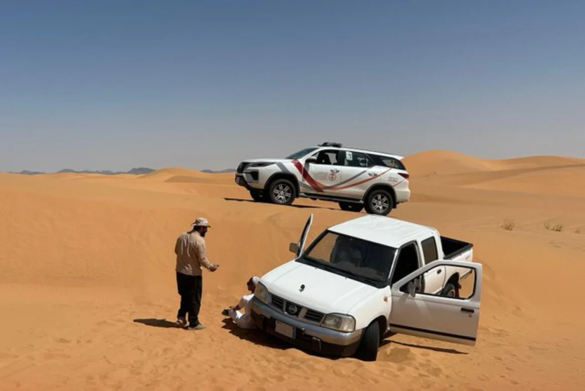أنقذ فريق من الجوالين بمحمية نفوذ العريق، اليوم السبت، شابين علقت مركبتهما بالكثبان الرملية.
