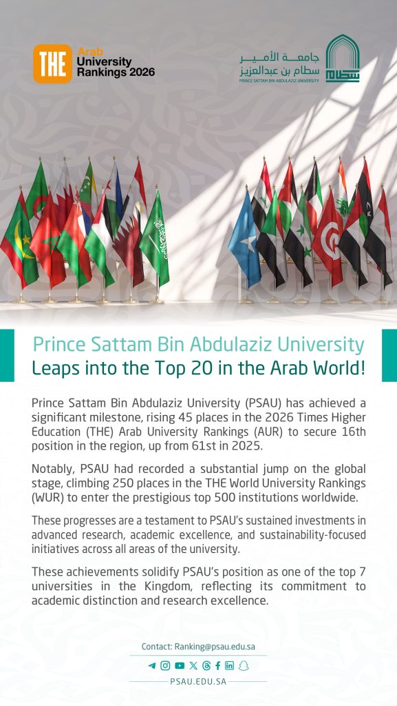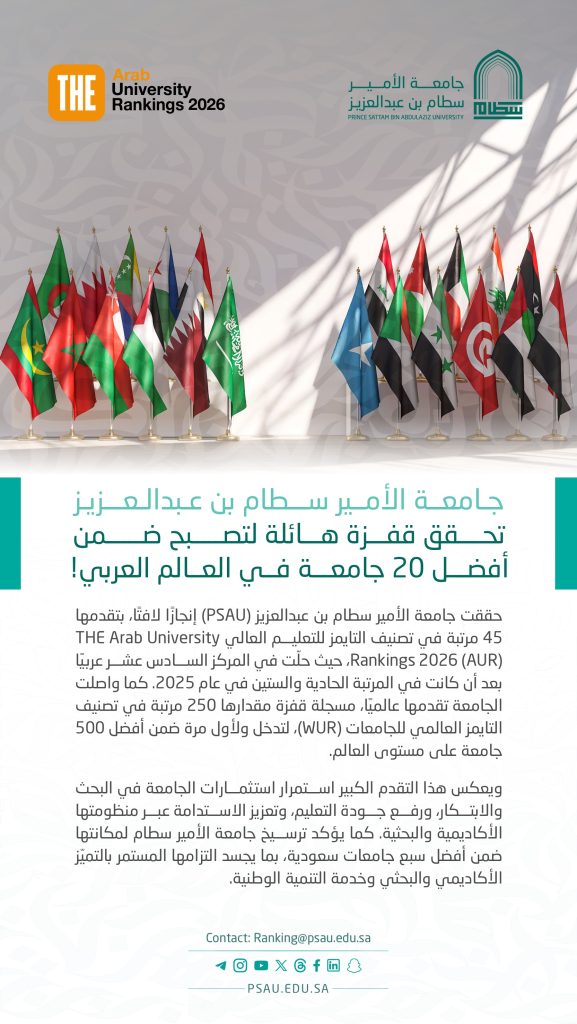 سجلت جامعة الأمير سطام بن عبدالعزيز تقدماً نوعياً في تصنيف التايمز للتعليم العالي للجامعات العربية (THE Arab University Rankings 2026)، حيث قفزت (45) مرتبة لتحتل المركز السادس عشر عربياً في تصنيف الجامعات العربية، بعد أن كانت في المرتبة الحادية والستين في تصنيف عام 2025.